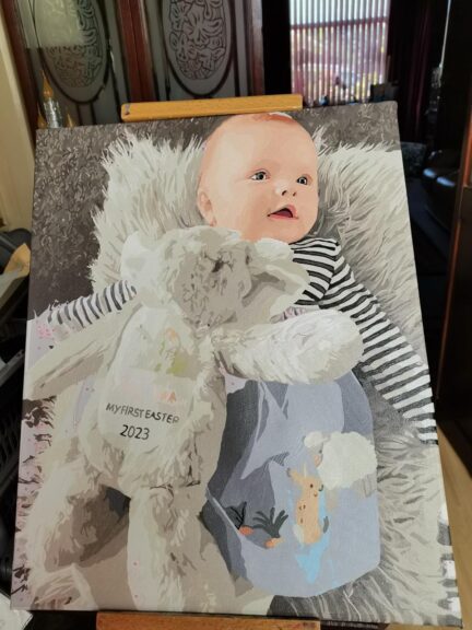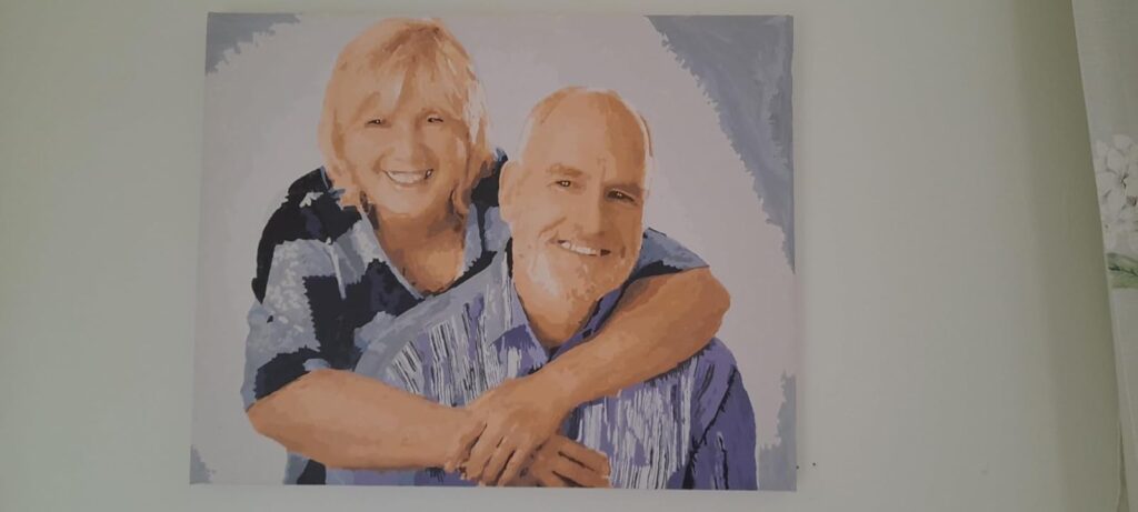 This was my 2nd painting, but first of people, so was apprehensive. The faces are done the last, and I decided if they were rubbish then the recipients wouldn’t get the gift. The eyes and mouths bring it to life, and I was pleased with the result. These cannot be rushed. This took several weeks, but have recently completed another one in 40 hours.