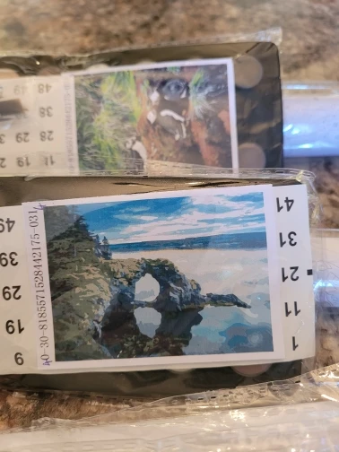 I decided to take a photo of a family pet and picked one that was mostly plain bar the dog. Submitted the photo and a well packaged parcel arrived. The canvas was rolled up on a firm plastic tube, so no kinks or creases at all. The paints were clearly labelled and had a separate sheet detailing colour against pot code and canvas colour. A large reference sheet was supplied and magnifier to help see the numbers. Very happy with the results and was received very well by its new owner. I did blend the sky as it was four distinct blues, the rest is almost to the numbers. I will be ordering another when I find the right photo.